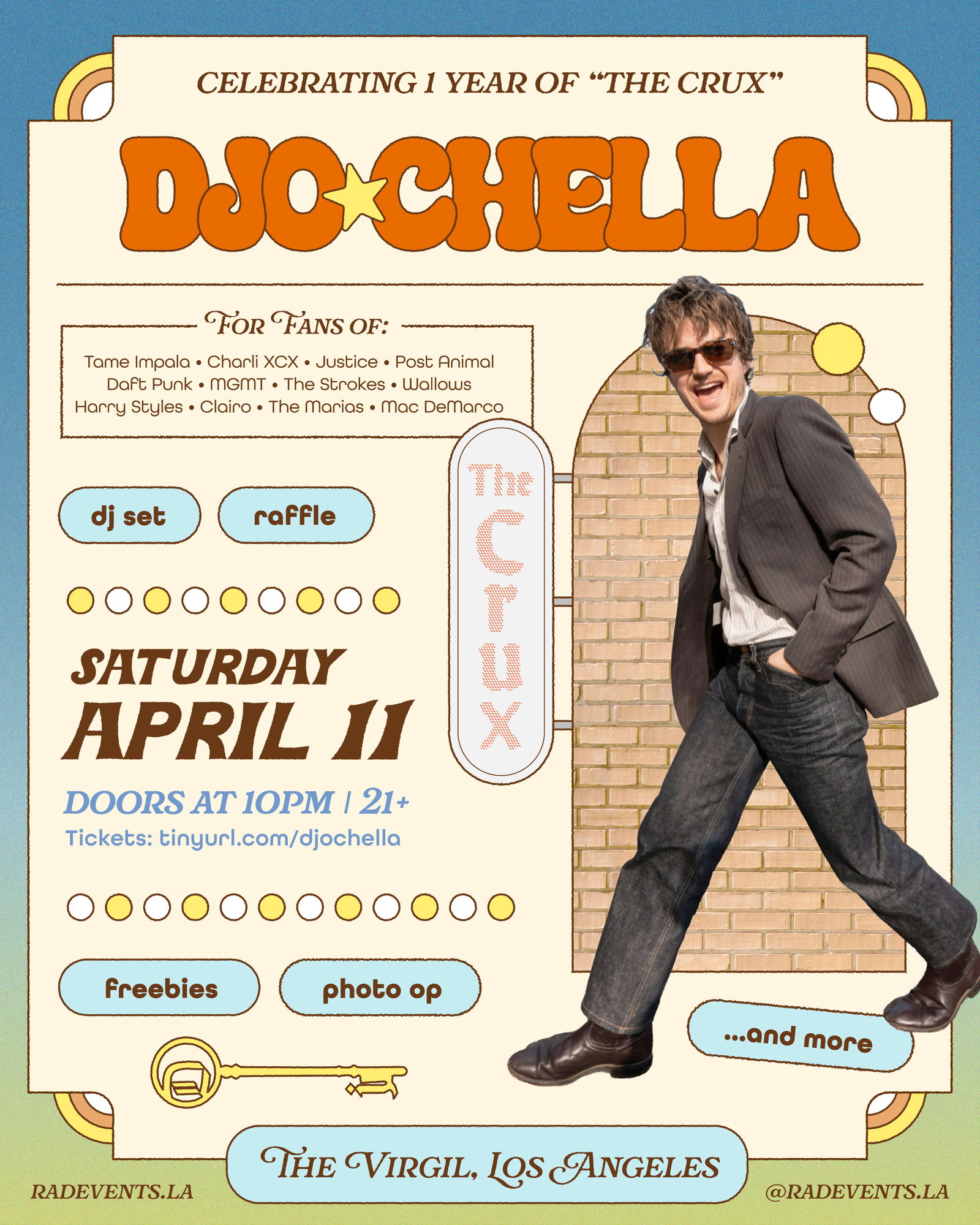 Celebrating the one-year anniversary of Djo’s “The Crux” with DJO-CHELLA: a dance night at The Virgil inspired by the music of Djo and other indie-pop artists.